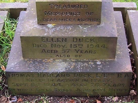 Treasured/ Memories Of/ A Dear Wife & Mother/ Ellen Duck,/ Died Nov. 15th 1944,/ Aged 57 Years./ Also Of/ Thomas Harland Duck, L/Bdr R.A./ Killed In Action In Italy,/ Sept. 6th 1944 – Aged 26 Years./ On Whose Souls Sweet Jesus Have Mercy