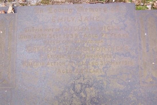 In Loving Memory of/ Emily Jane/ Beloved Wife Of William Hicks/ Died 29th Sept 1939 Aged 71 Years/ Also Of Their Beloved Son/ Gregory Thornton Hicks/ L-Stoker H.M.S. Invincible/ Killed In Action At Jutland 31st May 1916/ Aged 25 Years.