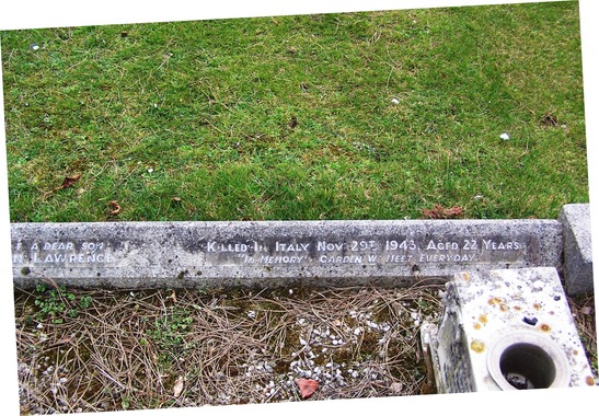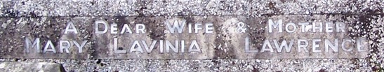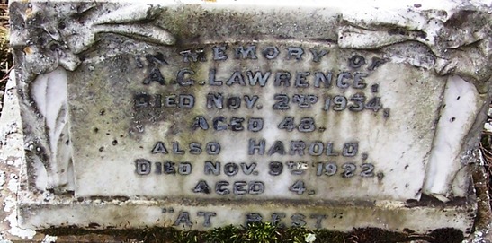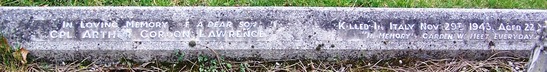Headstone:- In Memory Of/ A.G. Lawrence,/ Died Nov. 2nd1934,/ Aged 48./ Also Harold,/ Died Nov. 9th 1922, Aged 4./ “At Rest” Left kerb:- In Loving Memory Of A Dear Son Killed In Italy Nov 29th 1943, Aged 22. Cpl. Arthur Gordon Lawrence. “In Memory” Garden We Meet Everyday Right kerb:- A Dear Wife & Mother Died Nov 30th 1979, Aged 86 Years/ Mary Lavinia Lawrence
