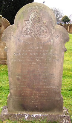 In Loving Memory Of / Joseph/ The Beloved Husband Of / Sarah Ann Simpson, / (Of New Frodingham)/ Who Passed Away May 12th 1912 / Aged 64 Years. / Thy Will Be Done / Also Of The Above / Sarah Ann Simpson, / Who Died July 27th 1930 / Aged 77 Years / Also Of Their Dear Son / Pte George Allen Simpson, / Who Was Killed In Action At Ypres / April 15th 1916/ Aged 21 Years ./ He Bravely Answered His Countrys Call / And Gave His Life For Us And All / At Rest.