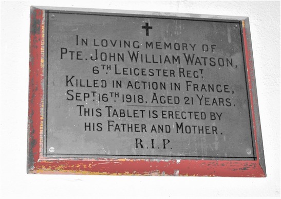 " In loving memory of Pte. John William Watson, 6th Leicester Regt. Killed in Action in France Sept. 16th 1918, aged 21 years" "This tablet is erected by his father and mother R.I.P."