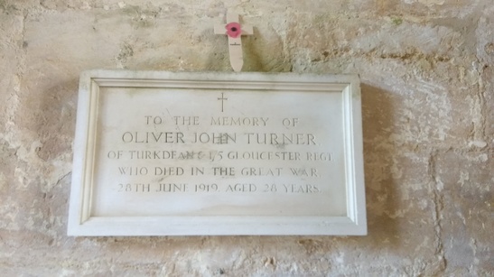TO THE MEMORY OF/ OLIVER JOHN TURNER/ OF TURKDEAN & 1/5TH GLOUCESTERSHIRE REGIMENT/ WHO DIED IN THE GREAT WAR/ 28TH JUNE 1919, AGED 29 YEARS.