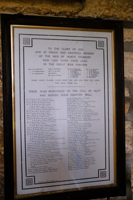 TO THE GLORY OF GOD AND IN PROUD AND GRATEFUL MEMORY OF THE MEN OF NORTH THORESBY WHO LAID DOWN THEIR LIVES IN THE GREAT WAR 1914-1918 THESE NOBLY PLAYED THEIR PARTS FOR GOD AND KING AND HOME THEY GAVE THEIR ALL