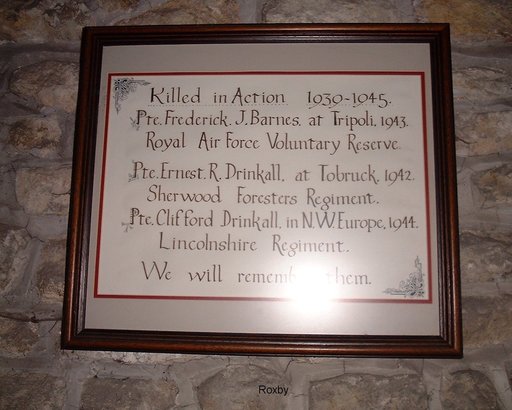 Killed in Action 1939-1945/Pte Frederick J Barnes at Tripoli 1943/Royal Air Force Voluntary Reserve/ Pte Ernest R Drinkall at Tobruk 1942/Sherwood Foresters Regiment/ Pte Clifford Drinkall in NW Europe, 1944/Lincolnshire Regiment/ We will remember them