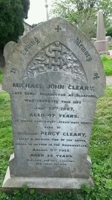 ...ALSO OF/ (...) PERCY CLEARY/ (...) BELOVED SON OF THE ABOVE,/ (...) DIED (...) IN THE DARDANELLES,/ AUGUST 9TH 1915/ AGED 32 YEARS/ (...)