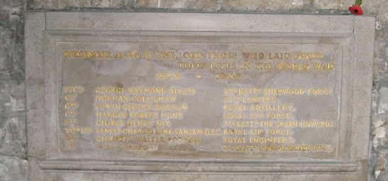 Lc//Cpl George Raymond Allam 2nd Battn Sherwood Forsts Cpl. Norman Collinshaw 27th Lancers Gnr Edwin George Dodson Royal Artillery Cpl Harold Robert Hunt Rouyal Air Force Pte George Henry Nix 7th Battn The Green Howards Sqdn Ldr Ernest Charles Lane-Sansom D.F.C. Royal Air Force Dvr Geoffrey Walter Sorrell Royal Engineers Pte David Thorold 4th Battn Lincolnshire Regt.