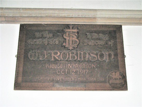 To The Glory Of God. In Loving Memory Of W J Robinson, Killed In Action October 12th 1917. Greater Love Hath No Man Than This. Presented By His Father Mother Sisters/ And/ Muriel Davies.[Now unreadable]