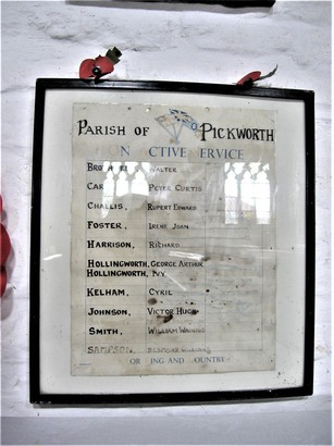 Parish of Pickworth on active service. Brothwell Walter/Carter Peter Curtis/Challis Rupert Edward/Foster Irene Joan/Harrison Richard/Hollingworth George Arthur/Hollingworth Ivy/Kelham Cyril/Johnson Victor Hugh/Smith William Waining/Sampson Desmond William. For King and Country.