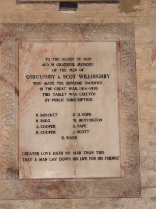 “To the Glory of God and in grateful memory of the men of Osbournby and Scott Willoughby who made the supreme sacrifice in the Great War, 1914 – 1919” (here follows list of names) “Greater love have no man than this, that a man lay down his life for friends”