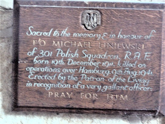 Sacred To The Memory And In Honour Of/ F/O/ Michael Liniewski/ Of 301 Polish Squadron, Raf/ Born 19th December 1911, Killed On/ Operations Over Hamburg, 9th August 1941/ Erected By The Patron Of The Living/ In Recognition Of A Very Gallant Officer/ Pray For Him