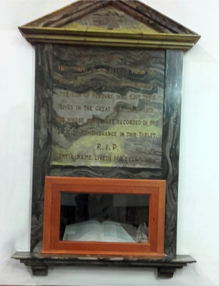 Horbury WW1 tablet and Book of Remebrance within the chapel, date of pboto estimated - Taken by Horbury and Osset Family History website 05 Feb 2021