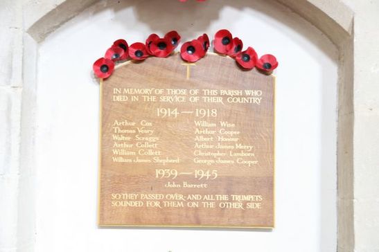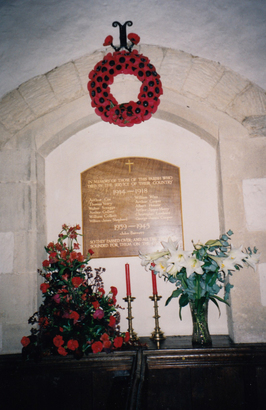 + / IN MEMORY OF THOSE FROM THIS PARISH WHO / DIED IN THE SERVICE OF THEIR COUNTRY / 1914 - 1918 / (12 NAMES) / 1939 - 1945 / (1 NAME) / SO THEY PASSED OVER - AND ALL THE TRUMPETS / SOUNDED FOR THEM ON THE OTHER SIDE