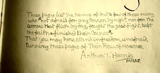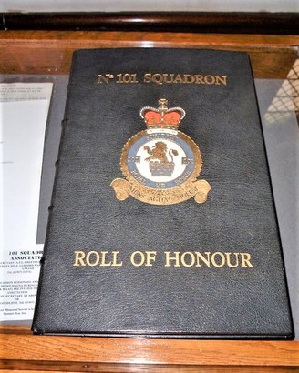 Cover: No. 101 SQUADRON/ ROLL OF HONOUR Frontispiece, upper: Western Front 1917-1918 Somme 1918/ Ypres 1917 Fortress Europe 1940-1944/ Invasion Ports 1940 Berlin 1941/ Ruhr 1940-1945 Normandy 1944 Frontispiece, lower: These pages list the names of but a few of those many/ who "not afraid for any terror by night, nor for the/ arrow that flieth by day, fought the good fight, kept/ the faith & finished their Course"./ That you may here stand in freedom, unafraid,/ turning these pages of Their ROLL OF HONOUR./ (Signature)