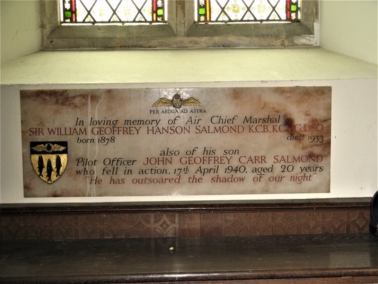 PER ARDU AD ASTRA/In loving memory of Air Chief Marshal/SIR WILLIAM GEOFFREY HANSON SALMOND K.C.B. K.C. G.D.S.O./died 1933/also of his son/Pilot Officer JOHN GEOFFREY CARR SALMOND/who fell in action 17th April 1940, aged 20 years/"He has outsoared the shadow of our night"