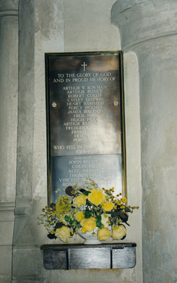 WW1 - To the Glory of God and in proud memory of (Names) who fell in the Great War 1914 - 1918 WW2 - And also of (Names) who fell in the 1939 - 1945 War "Their name liveth for evermore"