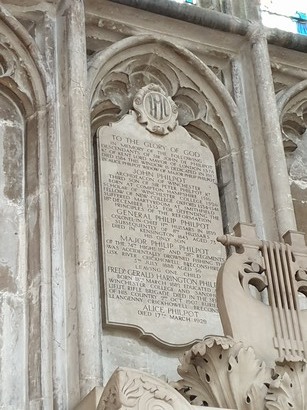 TO THE GLORY OF GOD IN MEMORY OF THE FOLLOWING DESCENDANTS OF SIR JOHN DE PHILIPOT KT OF KENT LORD MAYOR OF LONDON 1378 DIED 1384 THIS WINDOW IS DEDICATED IN 1917 BY ALICE PHILPOT WIDOW OF MAJOR PHILIP PHILPOT JOHN PHILPOT ARCHDEACON OF WINCHESTER THIRD SON OF SIR PETER PHILPOT KT BORN AT COMPTON HAMPSHIRE 1516 SCHOLAR OF WINCHESTER COLLEGE 1526 FELLOW OF NEW COLLEGE OXFORD 1534 - 1541 SUFFERED MARTYRDOM AT SMITHFIELD 18TH DECEMBER 1555 FOR DEFENDING THE PRINCIPLES OF THE REFORMATION GENERAL PHILIP PHILPOT COLONEL-IN-CHIEF 11TH HUSSARS IN 1839 SUBSEQUENTLY OF 8TH HUSSARS DIED IN KENSINGTON 1843 AGED 73 HIS ONLY SON MAJOR PHILIP PHILPOT OF THE 74TH HIGHS 11TH AND 28TH REGIMENTS WAS ACCIDENTALLY DROWNED FISHING THE USK RIVER CRICKHOWELL BRECONSHIRE 5TH JULY 1888 AGED 56 LEAVING ONE CHILD FREDK GERALD HARINGTON PHILPOT BORN 18TH MARCH 1882 EDUCATED AT WINCHESTER COLLEGE AND SANDHURST LIEUT. RIFLE BRIGADE DIED IN THE SERVICE OF HIS COUNTRY 2ND OCT 1907 BURIED LLANGENNY CRICKHOWELL BRECONS ALICE PHILPOT DIED 17TH MARCH 1929