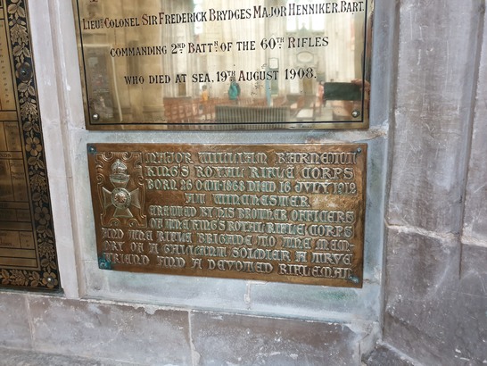 Major William Barnett King'S Royal Rifle Corps, born 26 Oct 1868, died 16 July 1912 at Winchester. Erected by his brother officers of The King'S Royal Rifle Corps and the Rifle Brigade to the Memory of a Gallant Soldier a True Friend and a devoted Rifleman.