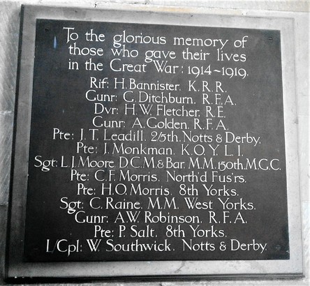 Rif H Bannister KRR/ Gunr C Ditchburn RFA/ Dvr H W Fletcher RE/ Gunr A Golden RFA/ Pte J T Leadill 25th Notts & Derby/ Pte J Monkman KOYLI/ Sgt L I Moore DCM & Bar MM 150th MGC/ Pte C F Morris North'd Fus/ Pte H O Morris 8th Yorks/ Sgt C Raine MM West Yorks/ Gunr A W Robinson RFA/ Pte P Salt 8th Yorks/ L Cpl W Southwick Notts & Derby