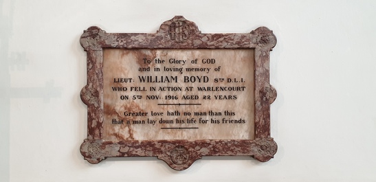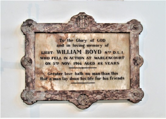 To The Glory Of God/ And In Loving Memory Of/ Lieut: William Boyd 8th D.L.I./ Who Fell In Action At Warlencourt/ On 5th Nov: 1916 Aged 22 Years/ Greater Love Hath No Man Than This/ That A Man Lay Down His Life For His Friends.