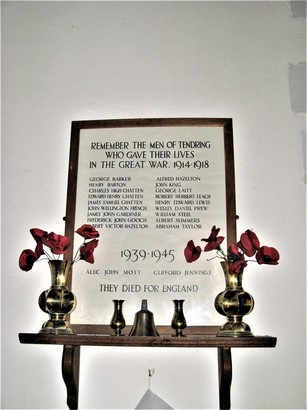 Remember The Men Of Tendring/ Who Gave Their Lives/ In The Great War. 1914 - 1918/ (Names)/ 1939 - 1945/ (Names)/ They Died For England.