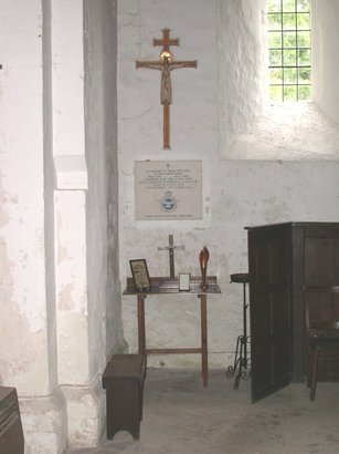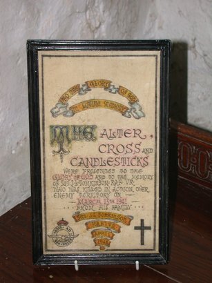 Tablet - In memory of those who fell in two Great Wars 1914 - 1918 1939 - 1945 Warnford gave one of her sons John Labasse Tomkinson, R.A.F.V.R. Killed in action with 214 Squadron. 13th March 1941. "Their name liveth for evermore." Roll of Honour - To the Glory of God in loving memory THE ALTER (sic), CROSS and CANDLESTICKS were presented to the Glory of God and to the memory of Sgt.J.L.Tomkinson: R.A.F. V.R. who was killed in action over enemy territory on March 13th 1941 ...from his family.. Sgt: J.L.Tomkinson .RAF . VR. April 1943 Explanatory notice - THE WAR MEMORIAL Sgt. John Labasse Tomkinson R.A.F. V.R. 701366. Wireless Operator. Born 7th. June 1918. Killed in action on the night of 13th/14th. March 1941 Thursday/Friday. "Bomber Command's main target on the night of 13th/14th. March 1941 was Hamburg. Several altern ative targets were attacked but there was no raid on Cologne that night. Six aircraft failed to return from these operations, one of them a Wellington Mk.1C Serial No.N.2746 belonging to No. 214 Squadron (his aircraft). This aircraft was shot down by a night fighter near the German border, all but one of the creew being killed and buried in Esserveld Cemetery, Groningen, Holland; it is not known which target it had attacked. Strange as/it may seem, Sgt. Tomkinson was the only person from Warnford killed in either of the Great Wars. Prior to being called up at 18 he worked in Petersfield; his father worked for Mr. R.P. Chester as head stockman.