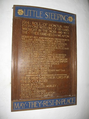 Little Steeping/ 1914 Roll Of Honour 1918/ Every One With One Of His Hands/ Wrought In The Work And With/ The Other Hand Held A Weapon/ (Names)/ These Men Gave Their Lives For/ Their Country/ (Names)/ May They Rest In Peace