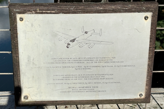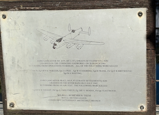 Avro Lancaster Wf4175, Of-U, 97 (Straits Settlements) Sqn Crashed On The Coningsby Gasworks On 30 March 1943 Returning From Operations To Berlin. All Of The Following Were Killed. Fg Off D W Francis, Fg Off P H Norton, Sgt J A Peel, Sgt W Standring, Sgt R Frank, Flt Sgt F R Birtwistle Sgt W H Whiting Avro Lancaster Pb422 Pb422, Of-P, 97 (Straits Settlements) Sqn Crashed In The River Bain On 13 July 1945 Returning From An Air Test. The Following Were Killed. Fg Off R W Wright, Flt Sgt A J Molyneux, Fg Off J L Bendix, Flt Sgt J Eastwood. We Will Remember Them Royal British Legion Coningsby Tattershall And District Branch
