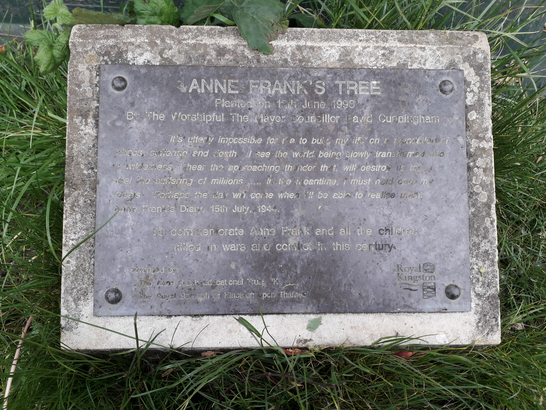 ANNE FRANK'S TREE/Planted on 12th June 1999/The Worshipful The Mayor Councillor David Cunningham/"It is utterly impossible for me to build my life on a foundation of/…, suffering and death. I see the world being slowly transformed into/wilderness. I hear the approaching thunder that will destroy us… I/….Perhaps the day will come when I'll be able to realise them/Anne Frank's Diary, 15th July 1944./To commemorate Anne Frank and all the children/killed in wars and conflicts in this century.