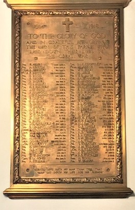 "1914 – 1918 To the glory of God and in grateful memory of the men from this parish who laid down their lives in the Great War" (here follows the names in two columns of sixty seven men in alphabetical order with their respective ranks and regiments) "Greater love hath no man than this, that a man lay down his life for his friends"