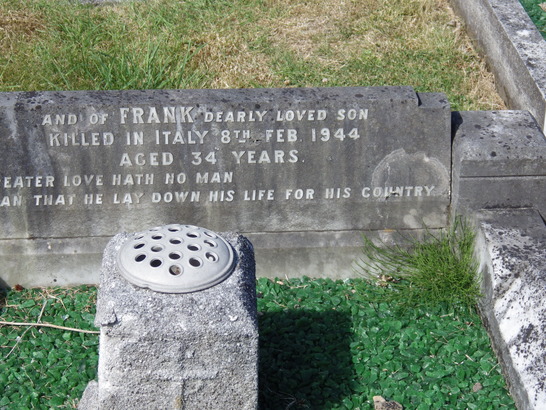 Headstone: And Of Frank Dearly Loved Son/ Killed In Italy 8th Feb. 1944/ Aged 34 Years. / Greater Love Hath No Man/ Than That He Lay Down His Life For His Country. Left Kerb: In Memory Of Arthur Fred Buckthorpe/ Died 5th Jan. 1944, Aged 70 Years. Right Kerb: And Of His Wife Gertrude/ Died 12th July 1973, Aged 100 Years.