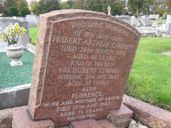 Treasured Memories/ of my dear ones/ Hubert Arthur Carrott,/ Died 28th March 1956/ Aged 68 Years./ And Of His Son/ F/O Hubert Edward/ Missing 9th Oct. 1943/ Aged 23 Years./ Also/ Florence,/ Wife And Mother Of Above/ Died 17th Aug. 1963/ Aged 75 Years./ Re-United.