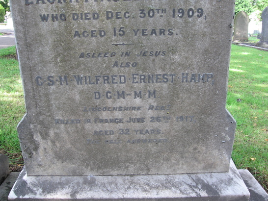 In Loving Memory of/ Hubert Walter Hamp,/ Who Died April 5th 1902/ Aged 18 Years/ “Thy Will Be Done.”/ Also/ Laura Madeline Hamp/ Who Died Dec. 30th 1909,/ Aged 15 Years./ Asleep In Jesus/ Also/ C.S.M. Wilfred Ernest Hamp/ D.C.M. M.M./ Lincolnshire Regt/ Killed In France June 26th 1917,/ Aged 32 Years./ The Call Answered