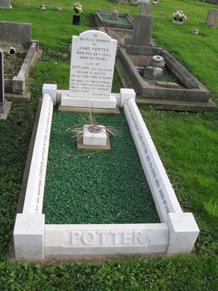 Headstone:- In/ Dearest Memory/ Of/ Anne Potter,/ Died Dec. 29th 1942,/ Aged 62 Years./ Also Of/ Arthur, Her Husband/ Killed In Action/ Sep. 20th 1917, Aged 31 Years./ “The Souls Of The Righteous/ Are In The Hands Of God, And/ There Shall No Torment/ Touch Them.”/ Wisdom 3.V.1. Right kerb:- And Of Their Son Stanley James Potter Died 15th April 1980, Aged 67 Years. Left kerb:- Also His Brother Gordon Arthur Potter, Died 11th January 1985, Aged 72 Years.