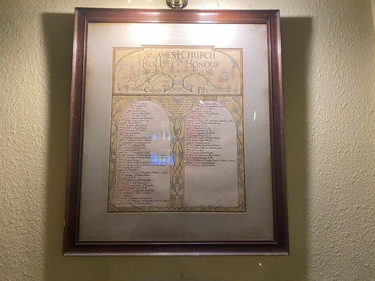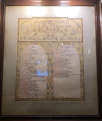 ST JAMES + CHURCH/ROLL OF HONOUR/AUGUST 1914-/CUPAR FIFE/[62 names in 2 columns of whom 5 fell]/happy are they/who fell in their youth in/the midst of their renown!/they have not beheld the tombs/of their friends, or failed to/bend the bow of/their strength