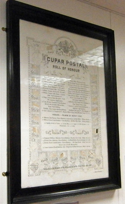 CUPAR POSTAL/ROLL OF HONOUR/CUPAR POST OFFICE STAFF WHO SERVED IN THE GREAT WAR/[names]/HONOURS/PALMAM QUI MERUIT FERAT/[22 names]/IN THE GREAT WAR THESE DIED IN THE CAUSE OF FREEDOM/[4 names]