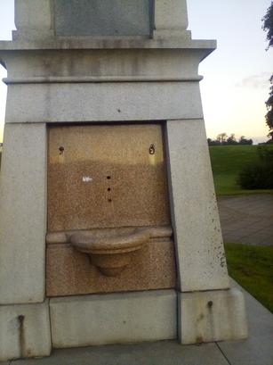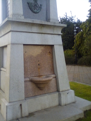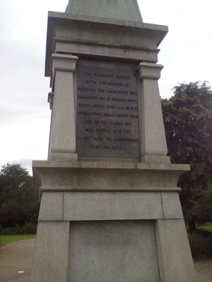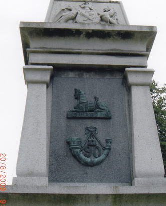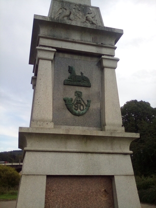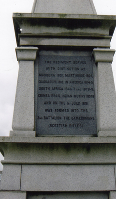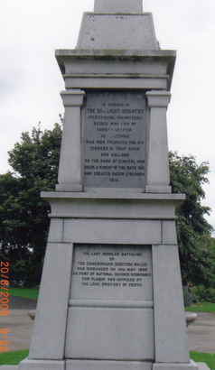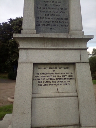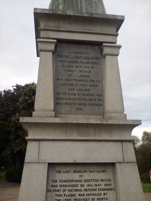[The plaque on the upper tier on the North West side (above the water basin) bears two carved (in relief) emblems, the lower a bugle incorporating '90' and the upper a Sphinx sitting over the name 'Egypt'.] North East Side Plaque-THE REGIMENT SERVED/WITH DISTINCTION AT/MANDORA 1801, MARTINIQUE 1809/GUADALOUPE 1810, IN AMERICA 1814-5/SOUTH AFRICA 1846-7 AND 1878-9/CRIMEA 1854-6, INDIAN MUTINY 1857-8/AND ON THE 1ST JULY 1881/WAS FORMED INTO THE/2ND BATTALION THE CAMERONIANS/(SCOTTISH RIFLES) North West Side Plaque-IN HONOUR OF/THE 90th LIGHT INFANTRY/(PERTHSHIRE VOLUNTEERS)/RAISED MAY 1794 BY/THOMAS GRAHAM/OF BALGOWAN/WHO WAS PROMOTED FOR HIS/SERVICES IN ITALY SPAIN/AND HOLLAND/TO THE RANK OF GENERAL 1809/MADE A KNIGHT OF THE BATH 1812/AND CREATED BARON LYNEDOCH/1814 North East Side Plaque-ERECTED/AD 1895/BY THE COUNTY AND CITY/OF PERTH/AND OFFICERS OF THE REGIMENT/PAST AND PRESENT North West Side Lower Pedestal-THE LAST REGULAR BATTALION/OF/THE CAMERONIANS (SCOTTISH RIFLES)/WAS DISBANDED ON 14TH MAY 1968/AS PART OF NATIONAL DEFENCE ECONOMIES)/THIS PLAQUE WAS UNVEILED BY/THE LORD PROVOST OF PERTH