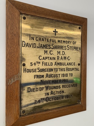 In grateful memory of David James Sherres Stephens, M.C., M.D., Captain R.A.M.C.. 54TH Field Ambulance, House Surgeon to the Hospital from August 1910 to November 1911. Died of wounds received in action, 24th October, 1917.