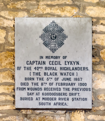 IN MEMORY OF / CAPTAIN CECIL EYKYN / OF THE 42nd ROYAL HIGHLANDERS. /[THE BLACK WATCH]/BORN THE 5th OF JUNE 1867 / DIED THE 8th FEBRUARY 1900 / FROM WOUNDS RECEIVED THE PREVIOUS / DAY AT KOODOOSBERG DRIFT, / BURIED AT MODDER RIVER STATION / SOUTH AFRICA.