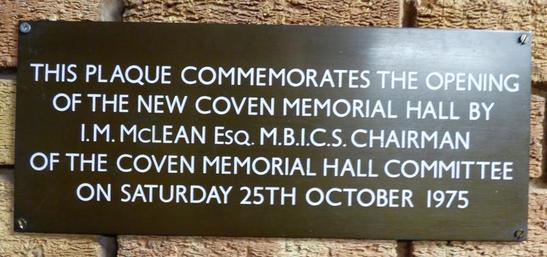 THIS PLAQUE COMMEMORATES THE OPENING / OF THE NEW COVEN MEMORIAL HALL BY / I.M.MCLEAN ESQ. M.B.I.C.S. CHAIRMAN / OF THE COVEN MEMORIAL HALL COMMITTEE / ON SATURDAY 25TH OCTOBER 1975