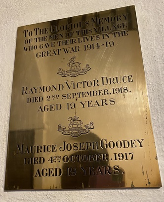To The Glorious Memory/of the men of this village/who gave their lives in the/Great War 1914-19/[regimental badge]/Raymond Victor Druce/died 2nd September, 1918/aged 19 years/[regimental badge]/Maurice Joseph Goodey/died 4th october, 1917/aged 19 years