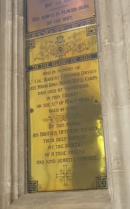 TO THE GLORY OF GOD / AND IN MEMORY OF / LT COL ROBERT CRADOCK DAVIES / LATE MAJOR KINGS ROYAL RIFLE CORPS / WHO DIED AT SHAWFORD / IN THIS COUNTY / ON THE 12TH OF AUGST 1890 / AGED 45 YEARS / BY THIS BRASS HIS BROTHER OFFICERS RECORD THEIR DEEP SORROW / AT THE DEATH / OF A TRUE FRIEND / AND KIND HEARTED COMRADE