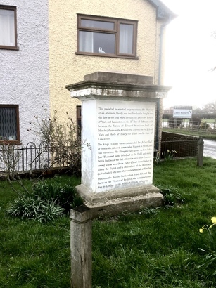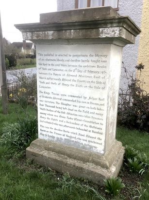 This pedestal is erected to perpetuate the Memory of an obstinate, bloody, and decisive battle fought near this Spot in the civil Wars between the ambitious houses of York and Lancaster, on the 2nd Day of February 1461 between the Forces of Edward Mortimer, Earl of March, (afterwards Edward the Fourth) on the Side of York and those of Henry the Sixth on the side of Lancaster. The King's Troops were commanded by Jasper Earl of Pembroke. Edward commanded his own in Person and was victorious. The Slaughter was great on both Sides Four Thousand being left dead on the Field and many Welsh Persons of the first distinction were taken Prisoners among whom was Owen Tudor (Great Grandfather to Henry the Eighth and a Descendant of the illustrious Cadwallader) who was afterwards beheaded at Hereford. This was the decisive Battle which fixed Edward the Fourth on the Throne of England who was proclaimed King in London on Fifth of March following.