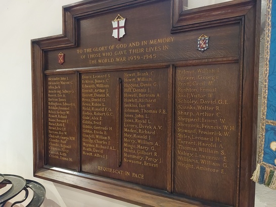 TO THE GLORY OF GOD AND IN MEMORY/ OF THSOE WHO GAVE THEIR LIVES IN/ THE WORLD WAR 1939 - 1945/ (NAMES)/ REQUIESCANT IN PACE
