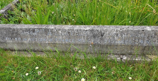 ALSO PTE A E TAYLOR SON OF J & E TAYLOR / KILLED IN ACTION IN FRANCE MAY 15TH 1915 AGED 24 YEARS / THOUGHTS OF HIM ARE ALWAYS NEAR / NO MORNING DAWNS / OR NIGHT RETURNS / BUT THAT WE THINK OF HIM