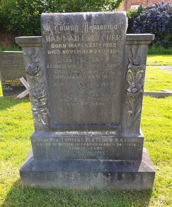 In Loving Memory of / HANNAH FLETCHER / BORN MARCH 13TH 1862 / DIED NOVEMBER 24TH 1934 / ALSO WILLIAM, / BELOVED HUSBAND OF THE ABOVE, / BORN MAY 20TH 1860 / DIED MARCH 24TH 1937. / ALSO FRANCIS ANN / FLETCHER/ DAUGHTER OF THE ABOVE / DIED AUG 8TH 1975 / AGED 83 YEARS./ ALSO OF PTE THOMAS FLETCHER, K.S.L.I. REGT / KILLED IN ACTION IN FRANCE MARCH 28TH 1918./ AGED 18 YEARS / "THY WILL BE DONE"