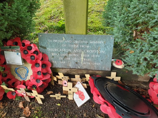 IN PROUD AND GRATEFUL MEMORY / OF THOSE FROM / THURCASTON AND CROPSTON / WHO LAID DOWN THEIR LIVES / IN THE GREAT WARS / 1914 - 1918 1939 - 1945