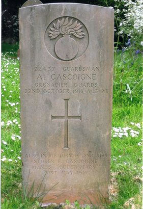 22437 Guardsman A. Gascoigne Grenadier Guards 22nd October 1916. Age 23. † Also In Memory Of Ss.115198 Stoker F. Cascoigne H.M.S. “Queen Mary” 31st May 1916