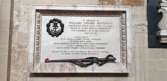 IN MEMORY OF / INGLEBY STUART JEFFERSON / LIEUTENANT ROYAL NAVY, AGED 24 YEARS. / KILLED IN ACTION WHEN IN COMMAND OF / H.M. SUBMARINE C34 IN THE NORTH SEA, / JULY 21ST 1917. / ELDER SON OF / DR WM DIXON AND MARY STUART JEFFERSON, / OF NORTH HOUSE RIPON. / GREAT GRANDSON OF THE REV WM GRAY CANON RESIDENTIARY / OF THIS CATHEDRAL (1829-1863), / AND OF ROBERT INGLEBY, LAWKLAND HALL, YORKSHIRE. / He gave his life to serve his God, his KIng, and his Country, / in defence of truth, liberty and justice