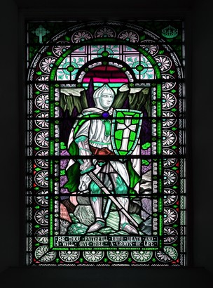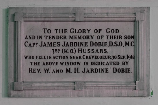 Plaque: TO THE GLORY OF GOD AND IN TENDER MEMORY OF THEIR SON CAPT JAMES JARDINE DOBIE, D.S.O, M.C. 3RD (K.O.) HUSSARS, WHO FELL IN ACTION NEAR CREVECOOEUR, 30 SEP. 1918 THE ABOVE WINDOW IS DEDICATED BY REV. W. AND M.H. JARDINE DOBIE.