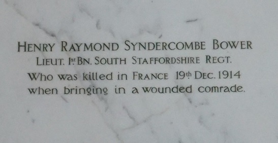Henry Raymond Syndercombe Bower, Lieut 1st Bn South Staffordshire Regiment, who was killed in France 19 Dec 1914 when bringing in a wounded comrade.